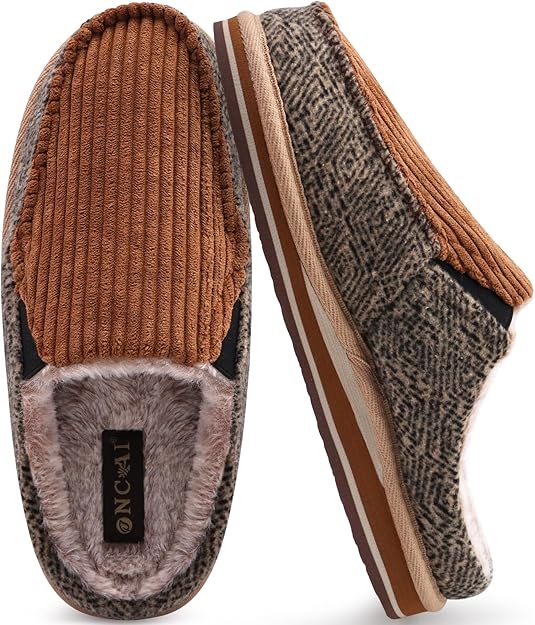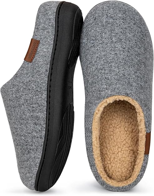 Men's Wool Felt Slippers Warm Fuzzy Faux Sherpa Slip-on Memory Foam Indoor House Slippers